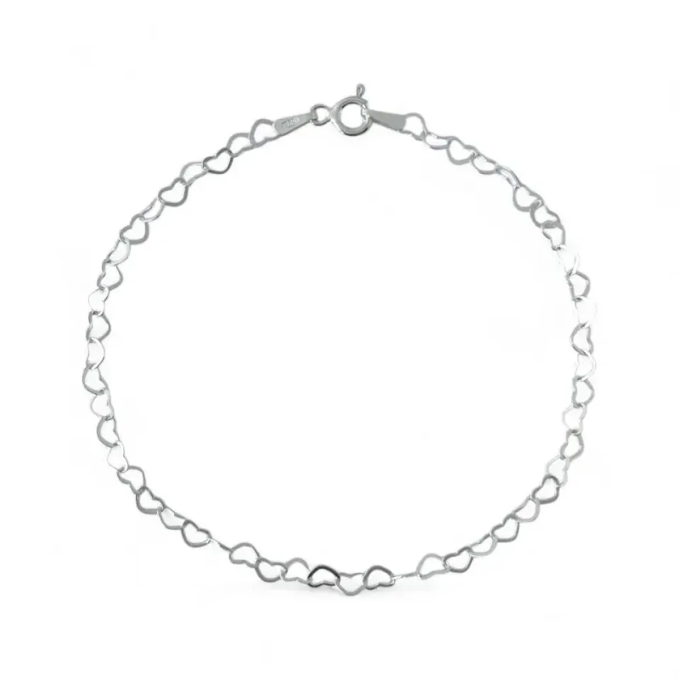 Feita em Prata 925, essa pulseira traz elos em formato de coração, criando um design romântico e sofisticado. Perfeita para quem ama acessórios delicados, mas cheios de personalidade.