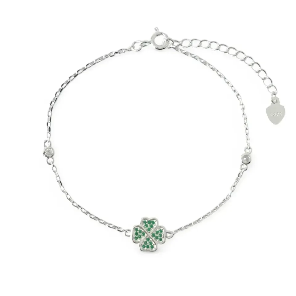Pulseira Trevo Prata 925 Verde com Zircônias